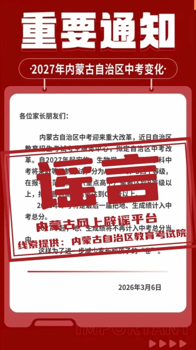 近日,网络流传一则关于“内蒙古自治区中考改革”的不实信息,称“自2027年起,生物学、地理学科目将采取等级制考试”等。针对此谣言,内蒙古自治区教育考试院已于2026年3月10日发布官方辟谣声明,明确指出以上信息均不属实,并提醒广大考生和家长从官方渠道获取权威信息,不信谣、不传谣。