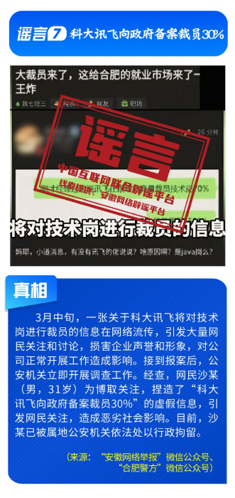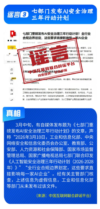 伪造政策文件,扰乱市场预期。《七部门重磅发布AI安全治理三年行动计划》完全是自媒体凭空杜撰,工信部等部门公开表示并无相关文件;“科大讯飞向政府备案裁员30%”系网民为博关注而捏造;“农业银行”发送高额贷款短信实为营销号冒名发送,并非银行官方行为;“深圳将禁行电动自行车”是对管理措施征求意见稿的误读;“多地试点开征新能源汽车‘里程税’”则列举虚假试点地区与收费标准,已被多地税务部门明确予以否认。