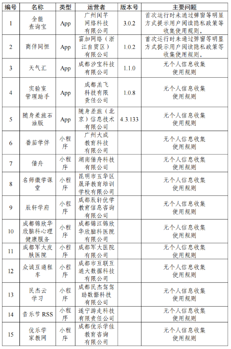 一、全能查询宝、商伴同恒等15款App无个人信息收集使用规则或在首次运行时未通过弹窗等明显方式提示用户阅读个人信息收集使用规则(详见下表)。