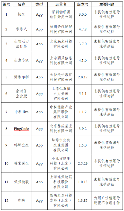 四、初念、零零汽等12款App未提供有效账号注销途径或为用户注销账号设置不合理条件(详见下表)。